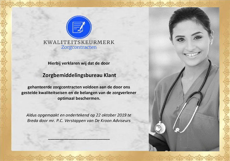 Met dit kwaliteitskeurmerk wordt aangegeven dat het bemiddelingsbureau zorgcontracten gebruikt, die voldoen aan het zelfstandigheidsvereiste voor zorgverleners en waarbij de aansprakelijkheid van de zorgverlener voor fiscale risico’s worden uitgesloten.